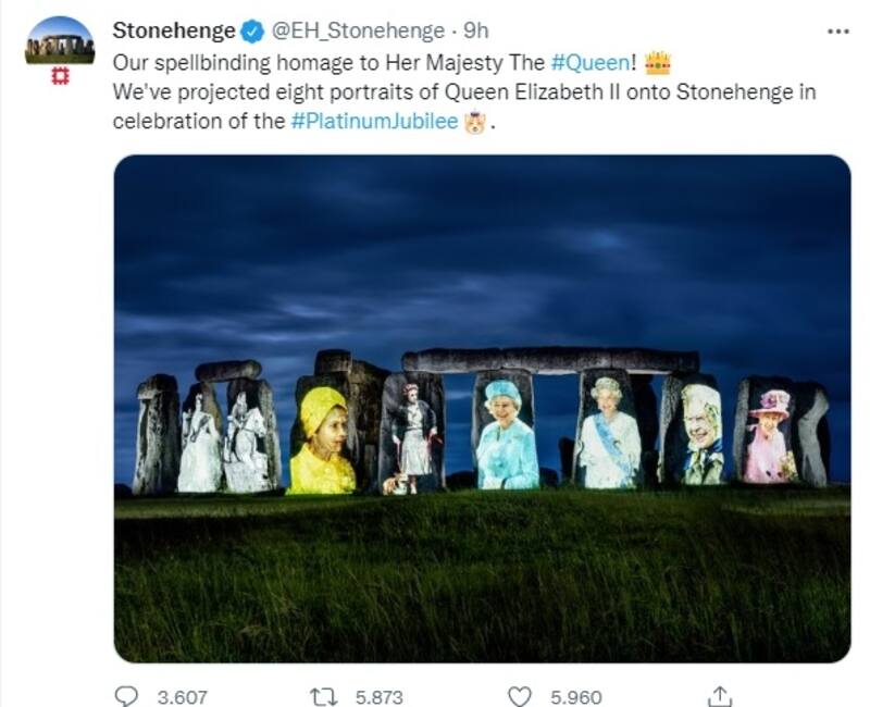 En el reconocido monumento de Wiltshire se proyectaron ocho fotografías de Su Majestad para marcar cada década de su reinado. De esta manera, se optó por mostrar una imagen de la reina Isabel en su coronación de 1953, otra montando a caballo en la década de 1960 y una de 1975, luciendo de amarillo en un viaje a México.
