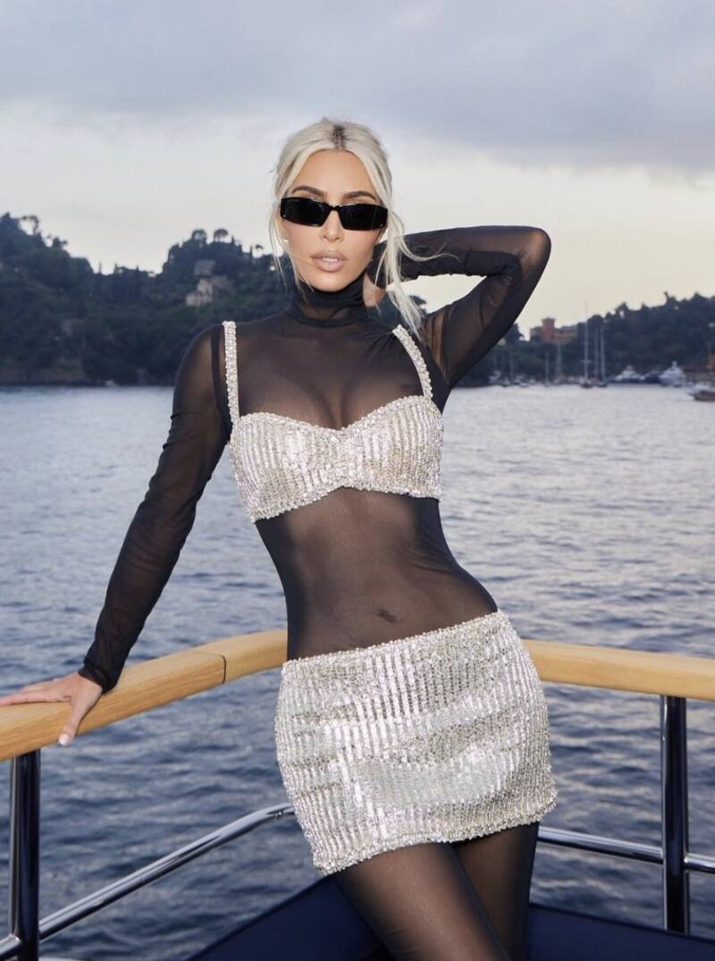 En las últimas publicaciones subidas por la ex de Kanye West se puede observar un carrete de fotos en las que se la ve luciendo un body transparente, debajo de un deslumbrante top plateado y una minifalda a juego, mientras la aspirante de abogada posa en un lujoso yate.