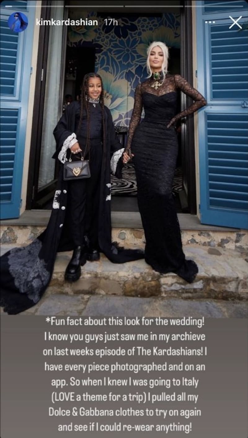 "¡Dato curioso sobre este look para la boda! ¡Sé que me acaban de ver en mi archivo en el episodio de "The Kardashians" de la semana pasada! Tengo cada pieza fotografiada y en una aplicación. Entonces, cuando supe que iría a Italia (ME ENCANTA un tema para un viaje), saqué toda mi ropa de Dolce & Gabbana para probarme de nuevo y ver si podía volver a usar algo", indicó.