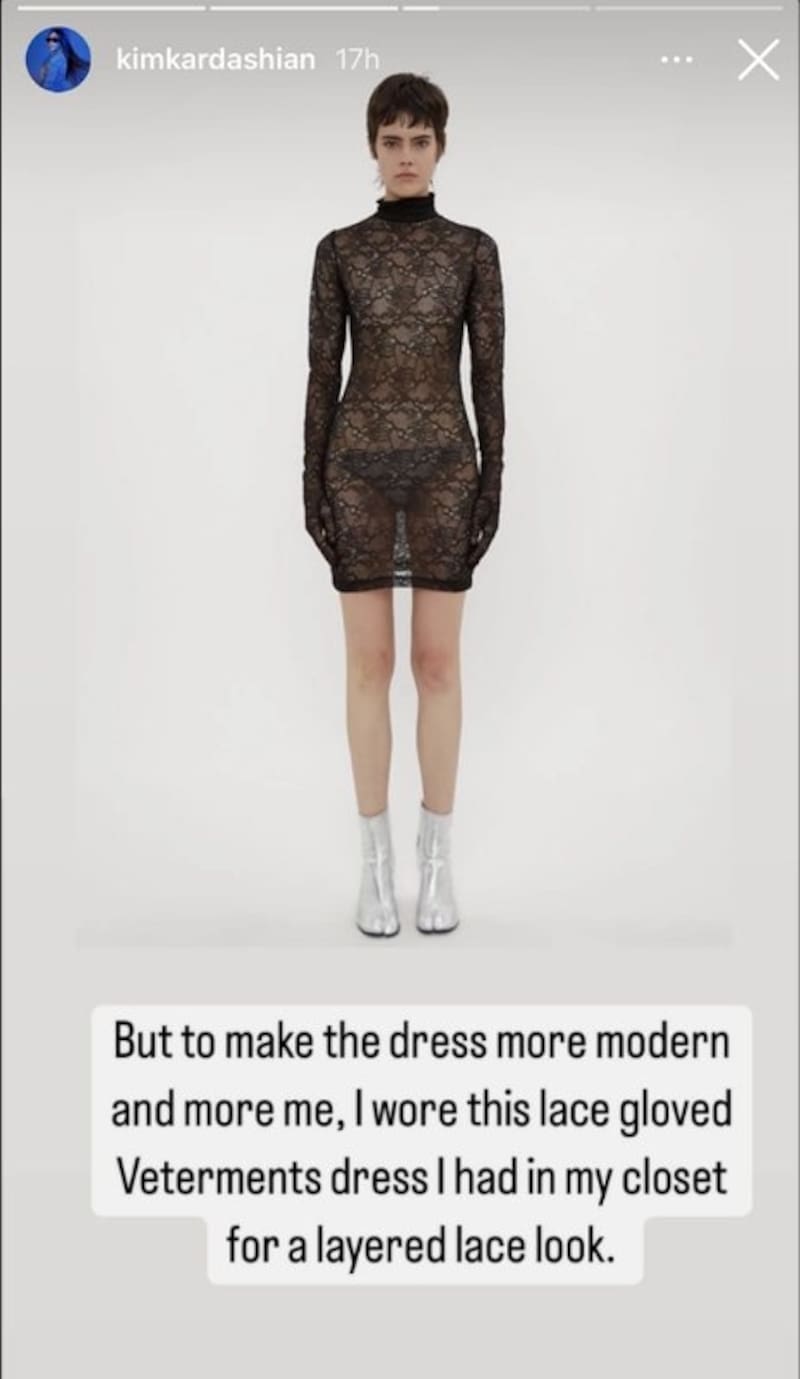 En esa búsqueda encontró un vestido de encaje y decidió arriesgarse y ponérselo debajo y agregar unos guantes de la misma tela para que el outfit luciera más moderno. "Usé este vestido Vetements con guantes de encaje que tenía en mi armario para una apariencia de encaje en capas".