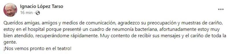 A través de su cuenta oficial de Facebook, el protagonista de "Macario" se pronunció sobre su estado de salud, agradeciendo al público y medios de comunicación su preocupación. Se mantiene positivo en su recuperación y advierte que pronto regresará a los escenarios.