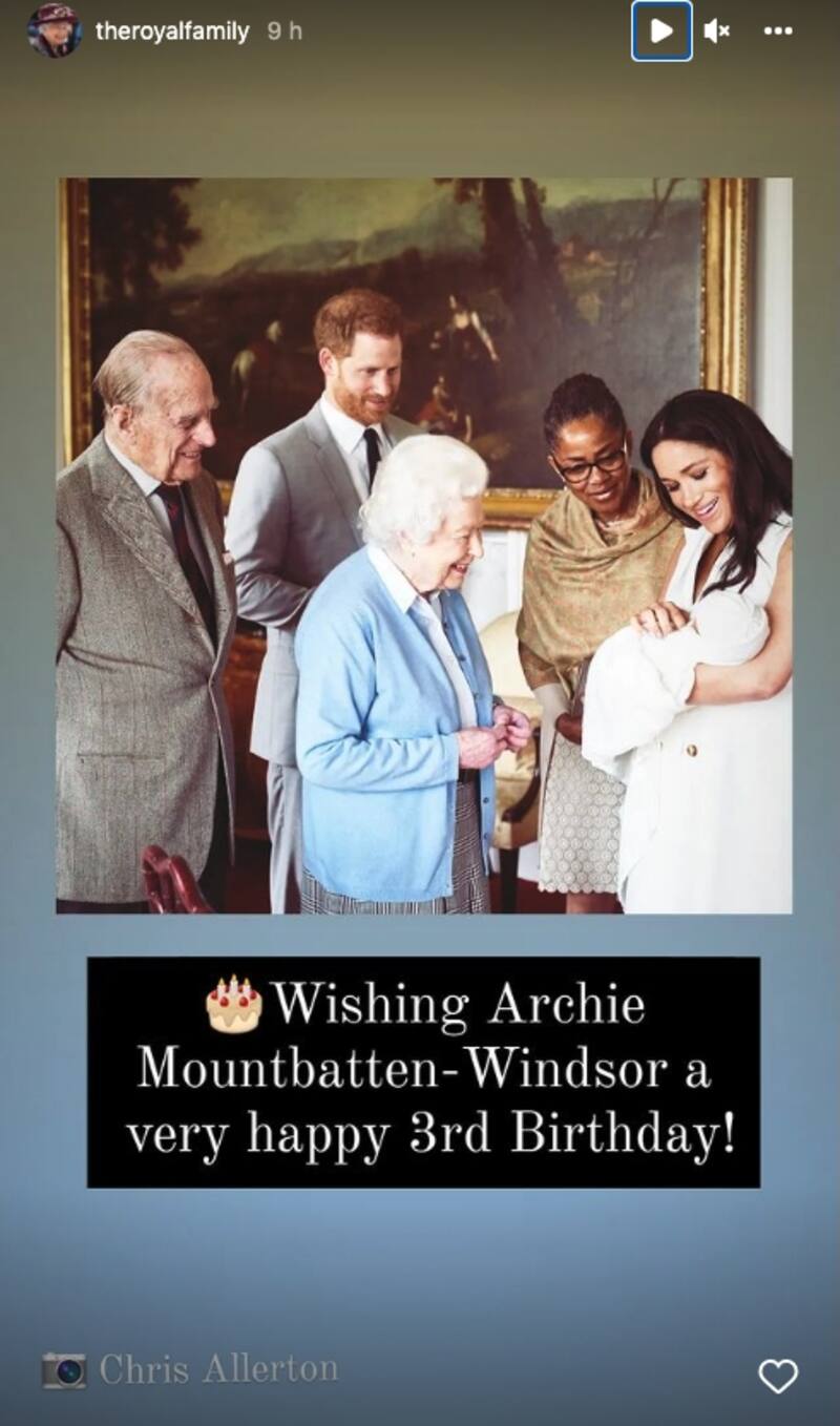 A la foto fue agrego un insípido mensaje: "Deseando a Archie Mountbatten-Windsor un muy feliz cumpleaños 3", la foto no fue compartida en el feed de @theroyalfamily, a comparación de las felicitaciones de los hijos del príncipe William, George y Charlotte, quienes celebraron su cumpleaños hace unos días.