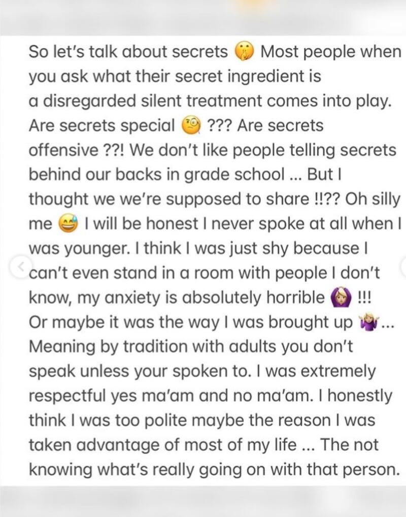 Además, compartió algunas reflexiones: "Hay que hablar de secretos. ¿Los secretos son especiales? ¿Los secretos son ofensivos? No nos gustaba que la gente no nos contará sus secretos cuando íbamos en primaria. ¿En realidad estamos obligados a compartir nuestros secretos? Soy ridícula. Debo ser honesta, yo casi no hablaba cuando era más pequeña. Creo que era muy tímida porque no me gustaba pararme en un cuarto en donde hubiera gente, mi ansiedad es absolutamente horrible. Tal vez es la forma en la que me criaron. Por tradición, no puedes dirigirle la palabra a un adulto a menos de que él te la dirija primero. Era muy respetuosa. Creo que era demasiado amable y por eso se han aprovechado de mí casi toda mi vida".