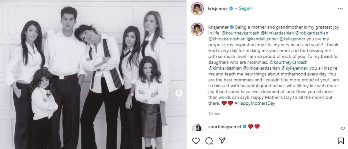 Además, dedicó un tierno saludo a sus hijas que son madres. "Kourtney Kardashian, Kim Kardashian, Khloé Kardashian, Kylie Jenner, todas me inspiran y me enseñan cosas nuevas sobre la maternidad todos los días. ¡Son las mejores mamis y no podría estar más orgullosa de ustedes!".