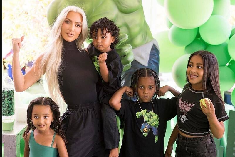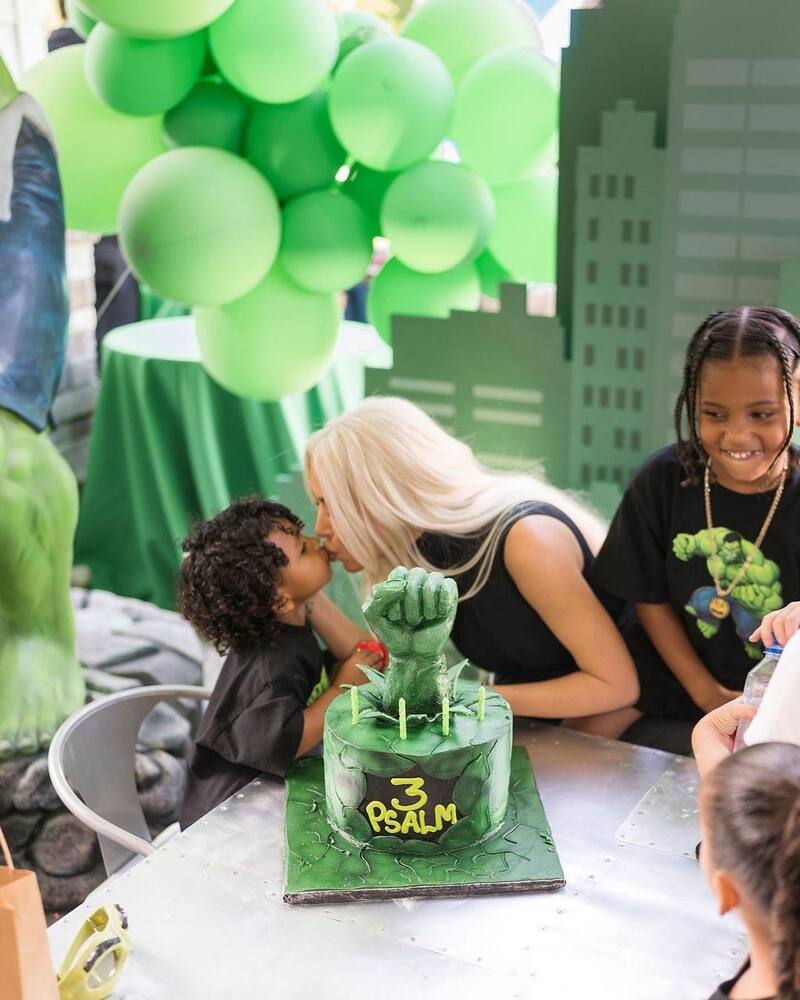 Kim y sus hijos posaron frente a un globo verde con las famosas manos de Hulk vistas en las paredes con su eslogan "Smash". El pastel era verde y también tenía el puño de "Hulk", junto con su nombre.