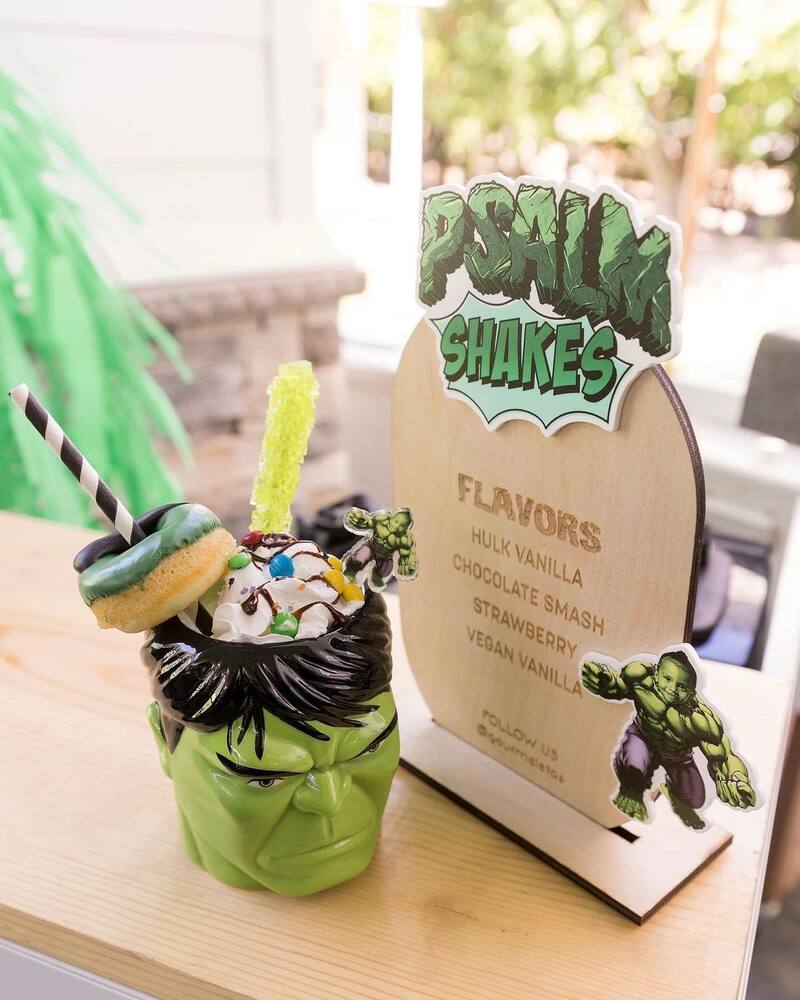El batido de aspecto delicioso también tenía una mini dona, caramelo de roca, crema batida y un recorte de Hulk en una taza con forma del hombre verde.