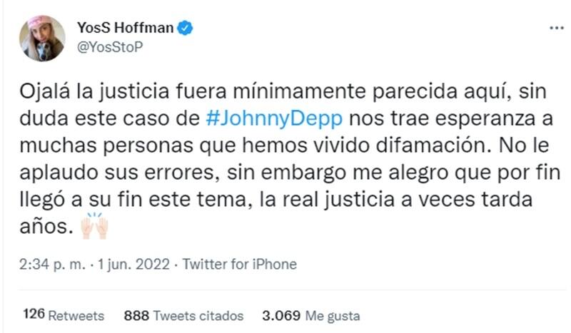 "Ojalá la justicia fuera mínimamente parecida aquí, sin duda este caso de #JohnnyDepp nos trae esperanza a muchas personas que hemos vivido difamación. No le aplaudo sus errores, sin embargo, me alegro que por fin llegó a su fin este tema, la real justicia a veces tarda años", escribió.