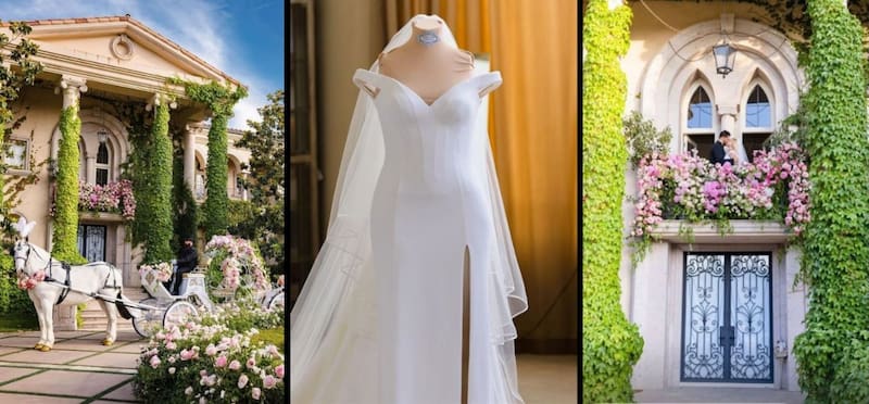 En otra de las postales se ve parte de la decoración que eligió la cantante para este día tan especial, la cual consistió en flores blancas y rosas. Además destaca un carruaje como de cuento de hadas, jalado por un caballo, el cual se especula fue el que llevó a la pareja hasta el altar.