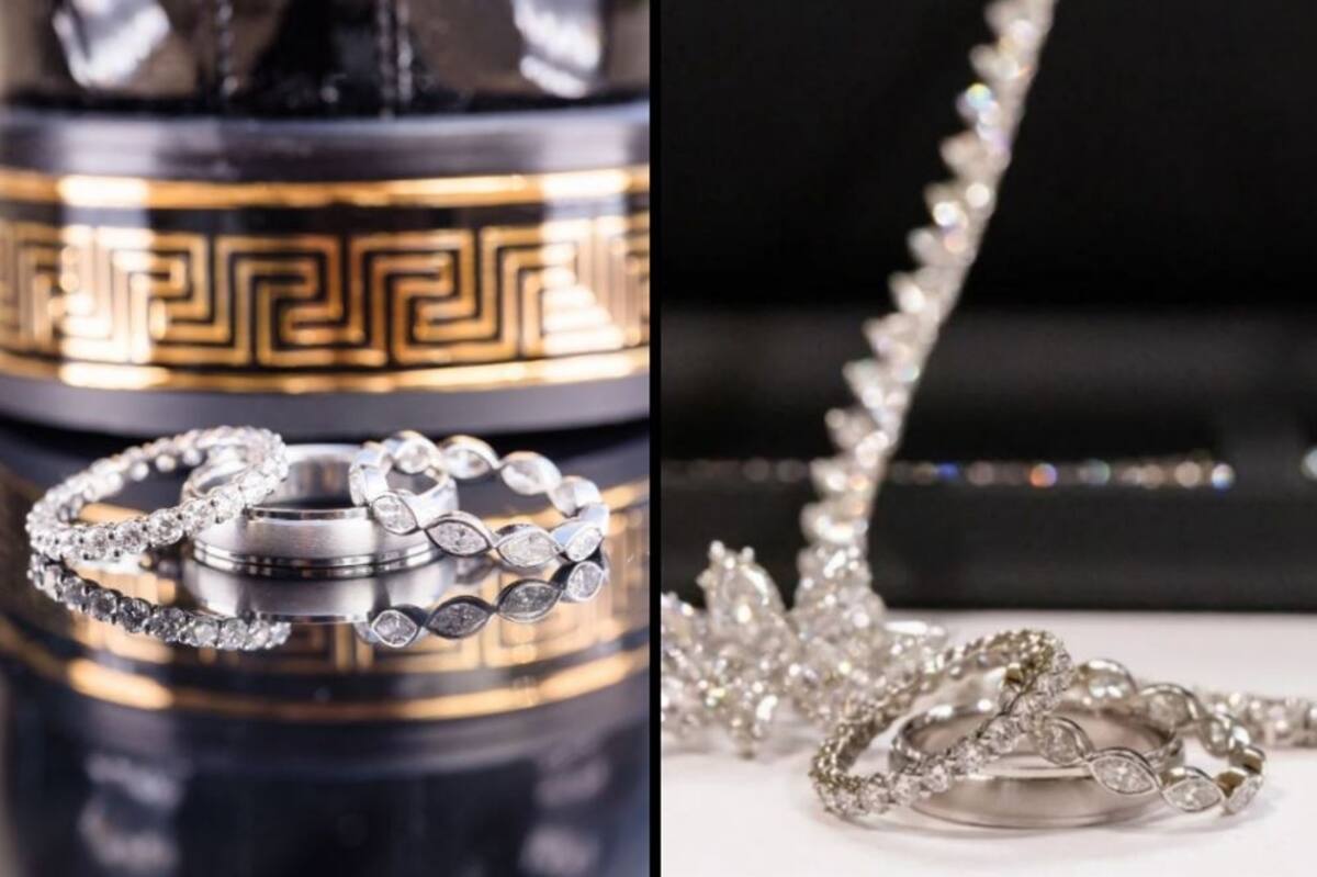 "Quería joyas simples y clásicas que fueran una declaración, pero que no quitaran ninguno de los otros detalles especiales de su día...Ambas bandas fueron creadas en platino y cuentan con un peso total de dos quilates de diamantes por banda", agregó la diseñadora de la joyería.