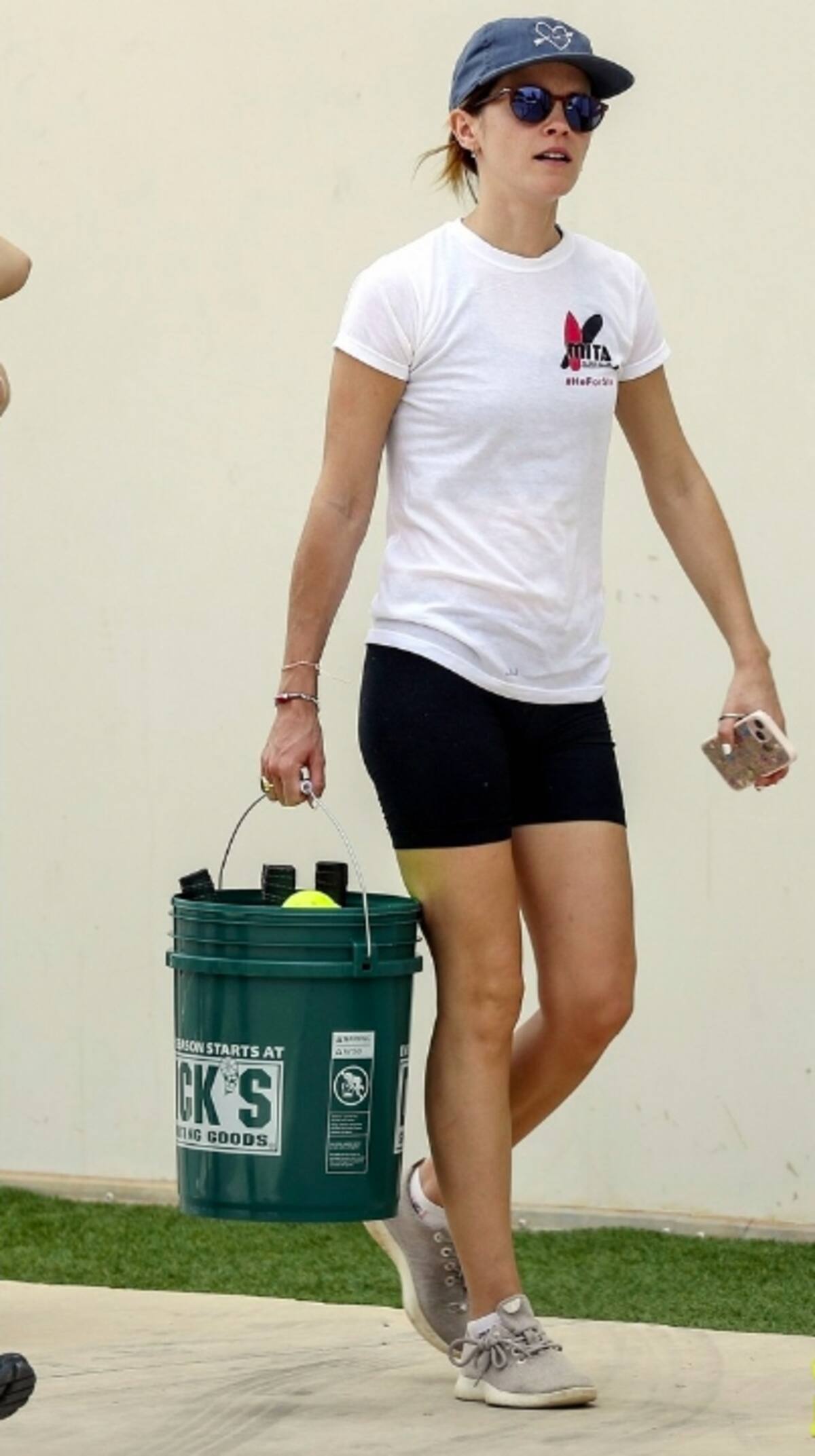 Lució muy cómoda con un conjunto deportivo color negro de top y biker short, zapatillas, una gorra de béisbol y lentes de sol. Llegó protegiéndose con una camiseta amplia pero después de la quitó para sentirse más cómoda y fresca para poder ganar el divertido partido amistoso.
