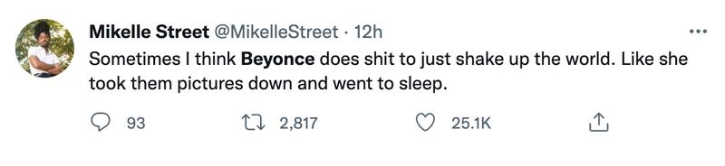 “A veces creo que Beyoncé hace cosas solo para causar polémica. Como que bajó las fotos de sus redes sociales y se fue a dormir”.