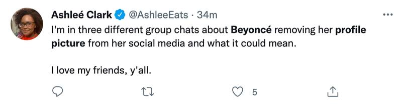 “Estoy en tres diferentes chats grupales sobre por qué Beyoncé borró su foto de perfil en redes sociales y lo que esto podría significar. Amo a mis amigos”.