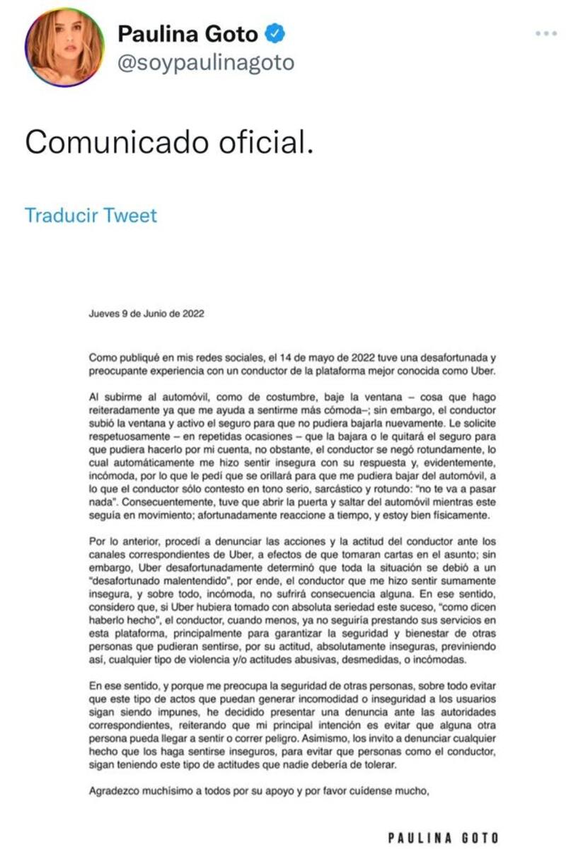 Paulina Goto informó que levantará una denuncia ante las autoridades correspondientes en contra del chofer de un Uber que la hizo pasar por una "desafortunada y preocupante experiencia", al no permitirle bajar del automóvil en el que se encontraba, ya que no recibió una respuesta adecuada por parte de la app de taxis y dicho chofer no recibirá ninguna sanción.