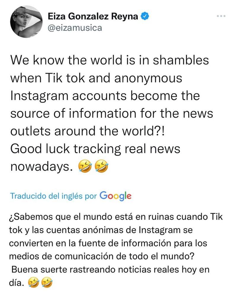 "¿Sabemos que el mundo está en ruinas cuando Tik tok y las cuentas anónimas de Instagram se convierten en la fuente de información para los medios de comunicación de todo el mundo? Buena suerte rastreando noticias reales hoy en día", escribió Eiza en la red social.