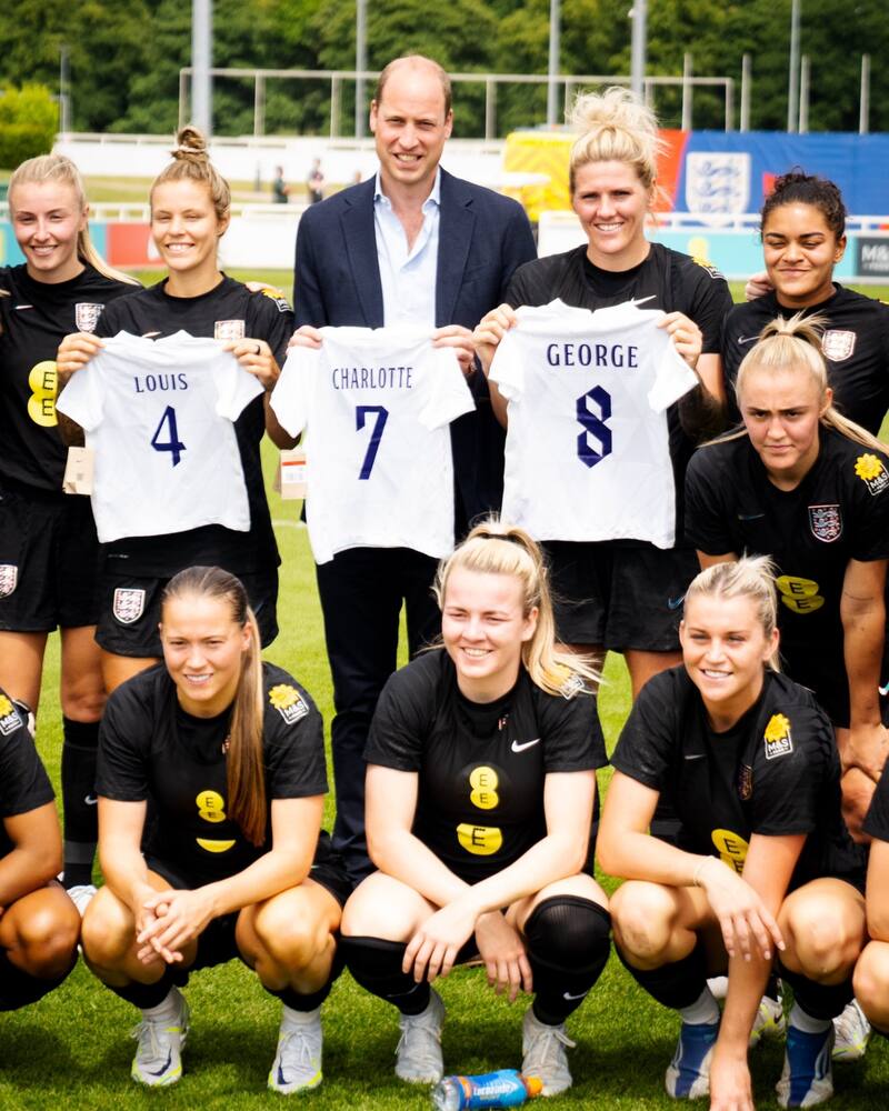 Las jugadoras le obsequiaron al duque de Cambridge camisetas para los pequeños miembros de la realeza con sus nombres en la espalda y un número correspondiente a su edad actual.