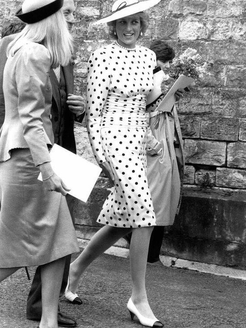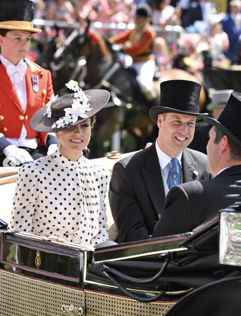 La duquesa de Cambridge eligió un vestido blanco clásico de lunares negros, de Alessandra Rich, valorado en 2,300 dólares. El cuál ha combinado con un sombrero floral blanco y negro a juego, confeccionado a medida, de Sally-Ann Provan. El estilo fue complementado con los aretes de diamantes y perlas de Lady Di.