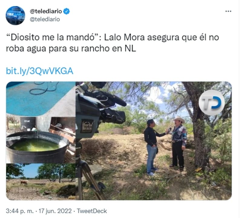 "Y, es más, allá en la 21, en Guadalupe, ahí vivo yo, me bañé con vaso… con botes, entonces no tengo por qué hacer eso. Que Lalo Mora el cantante y no sé qué más, pero yo no soy así, y no voy a hacer eso (robar agua), por eso tengo mis presas yo, esta agua es de lluvia, está hasta oscura por la hoja del monte, acarreo de basura", agregó el cantante.