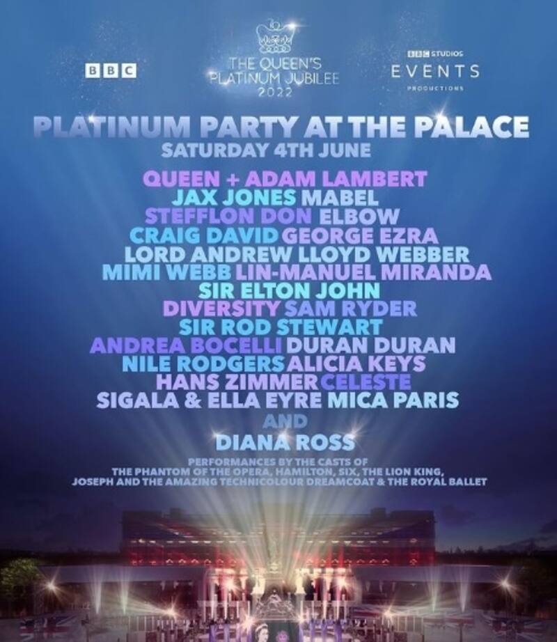 Los anfitriones Kirsty Young y Roman Kemp conducirán la cobertura en vivo de Platinum Party en el palacio. Un evento que será trasmitido en vivo en BBC One, BBC iPlayer y en toda la red de BBC. Un evento que recibirá a 22 mil personas y que está encabezado por Queen junto a Adam Lambert, Sir Elton John, Duran Dura, Andrea Bocelli y Alicia Keys, entre otros artistas.