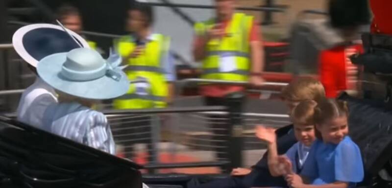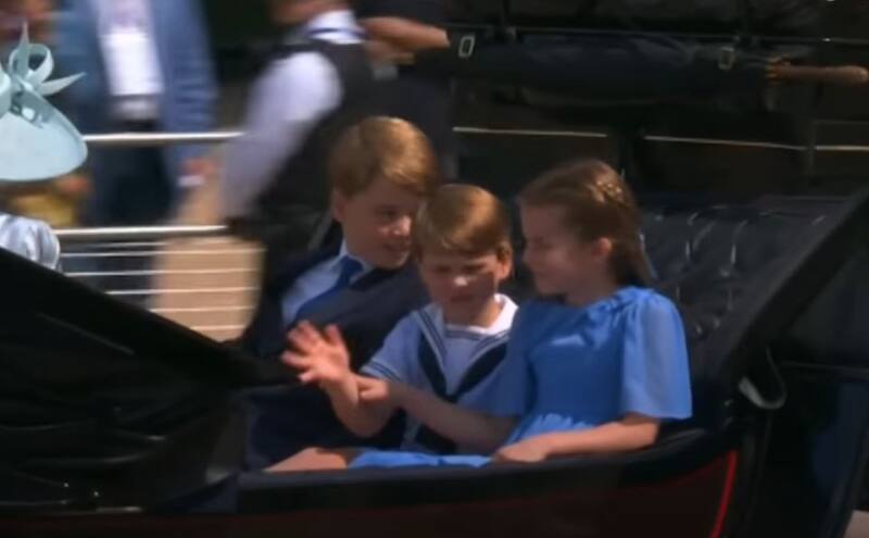 En las imágenes se puede ver a la pequeña de siete años, que porta un elegante vestido azul, cómo le pide a su hermano menor que se tranquilice sosteniéndolo brevemente de la mano mientras siguen el recorrido del Trooping the Colour a bordo de su carruaje.