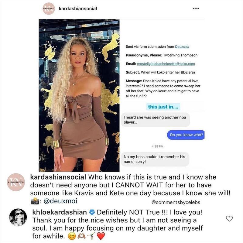 Todo comenzó cuando en la cuenta de Instagram de chismes de celebridades llamada DeuxMoi recogió los rumores de la celebridad había comenzado a salir con otro jugador de la NBA. Una publicación que compartió una cuenta de fanáticos de Khloé Kardashian con el siguiente mensaje: "Quién sabe si esto es verdad y yo sé que ella no necesita de nadie, pero no puedo esperar que ella tenga alguien como Kravis o Kete un día porque yo sé que lo hará".