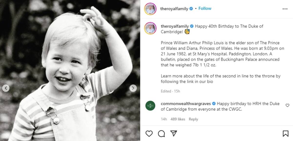 En paralelo, la cuenta de la Familia Real le deseó un feliz cumpleaños al príncipe William con un cariño saludo y una serie de fotos del duque. "El Príncipe William Arthur Philip Louis es el hijo mayor del Príncipe de Gales y Diana, Princesa de Gales. Nació a las 21:03 el 21 de junio de 1982, en el Hospital St Mary's, Paddington, Londres. Un boletín, colocado en las puertas del Palacio de Buckingham, anunciaba que pesaba 7 libras 1 1/2 oz", se puede leer en el mensaje.
