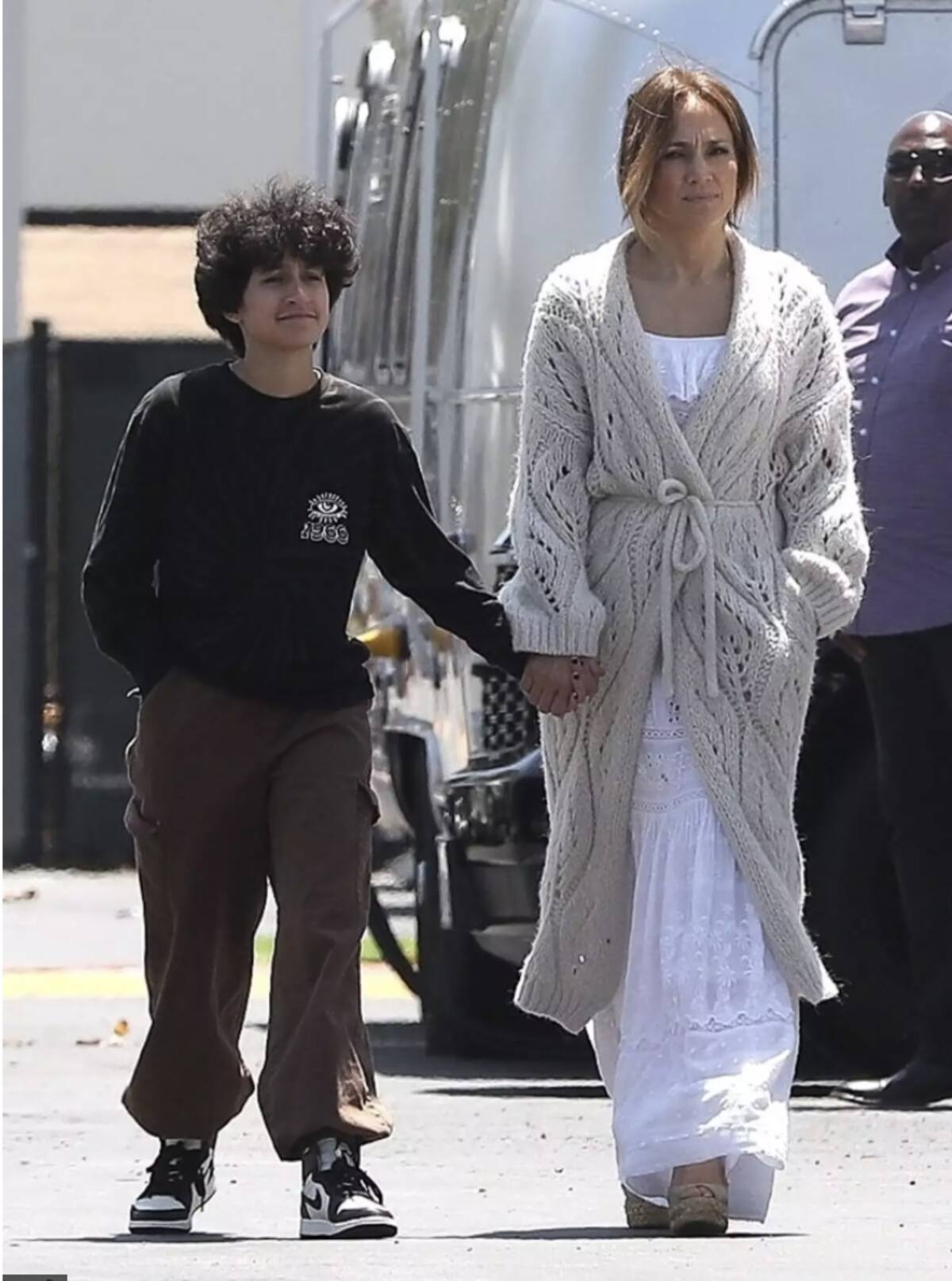En la fotografía tomada por los paparrazi se ve a Emme y JLo tomadas de la mano, utilizando looks relajados. La actriz utiliza un vestido blanco que complementó con un suéter beige mientras que la melliza utiliza unos jeans, una sudadera negra y unos tenis Nike, que quedan muy bien con la temática del filme.