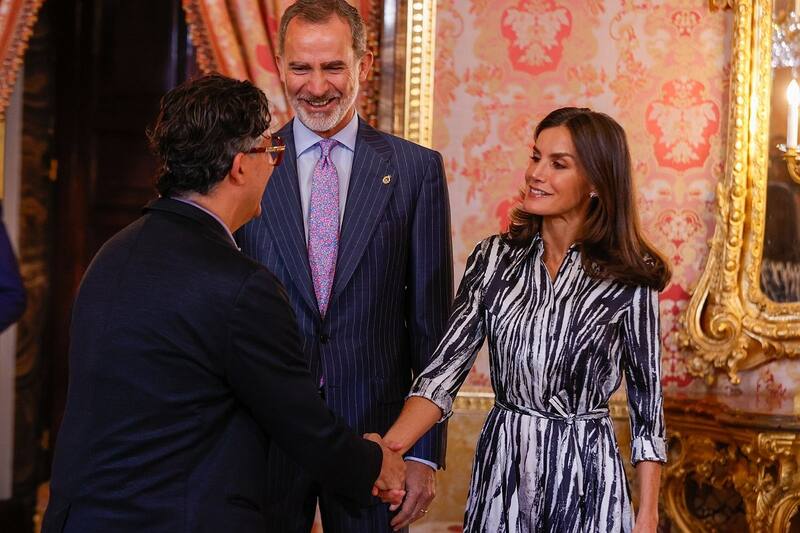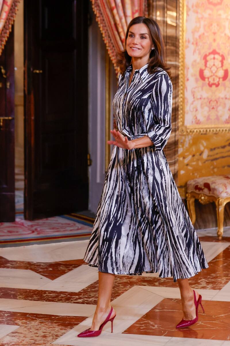 Con nuevo corte de cabello, la reina Letizia acudió en este evento con un vestido mido blanco y negro con estampado de cebra. Se trata de una prenda recuperó de su armario un modelo de las colecciones de Hugo Boss, el mismo que estrenó durante la visita oficial que hizo junto al rey a Cuba en el invierno de 2019.