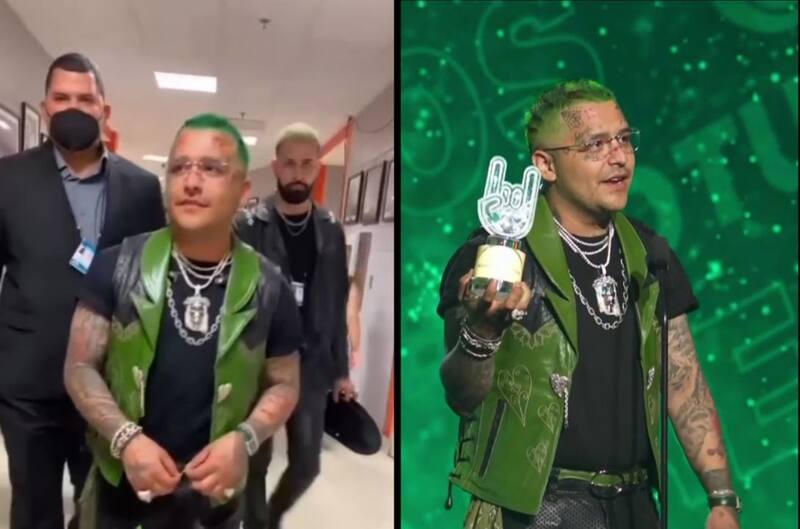 Christian Nodal se robó los reflectores en la gala de los Premios Tu Música Urbano, por su nuevo cambio de look, ya que en esta ocasión optó por usar su cabellera en color verde.