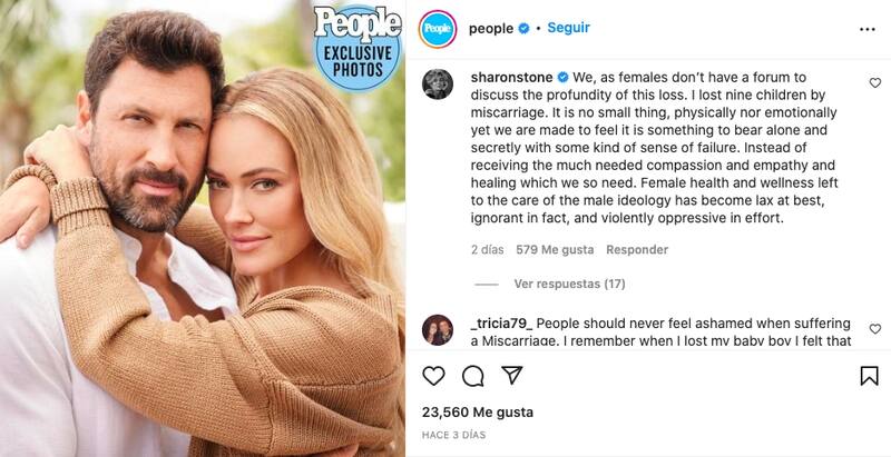 Sharon Stone compartió en Instagram que tuvo nueve abortos espontáneos. No lo hizo a través de su cuenta, sino en un comentario a la historia de la bailarina Peta Murgatroyd, participante de "Bailando con las estrellas", en la cuenta oficial de la revista People.
