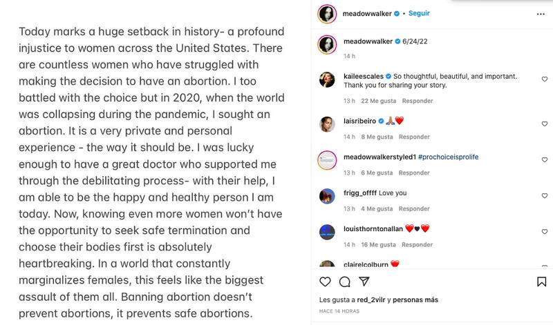 En su posteo, Meadow hizo referencia al panorama desolador que se avecina en Estados Unidos. "Ahora, saber que aún más mujeres no tendrán la oportunidad de buscar una terminación segura y elegir primero sus cuerpos es absolutamente desgarrador. En un mundo que constantemente margina a las mujeres, esto se siente como el mayor asalto de todos".
