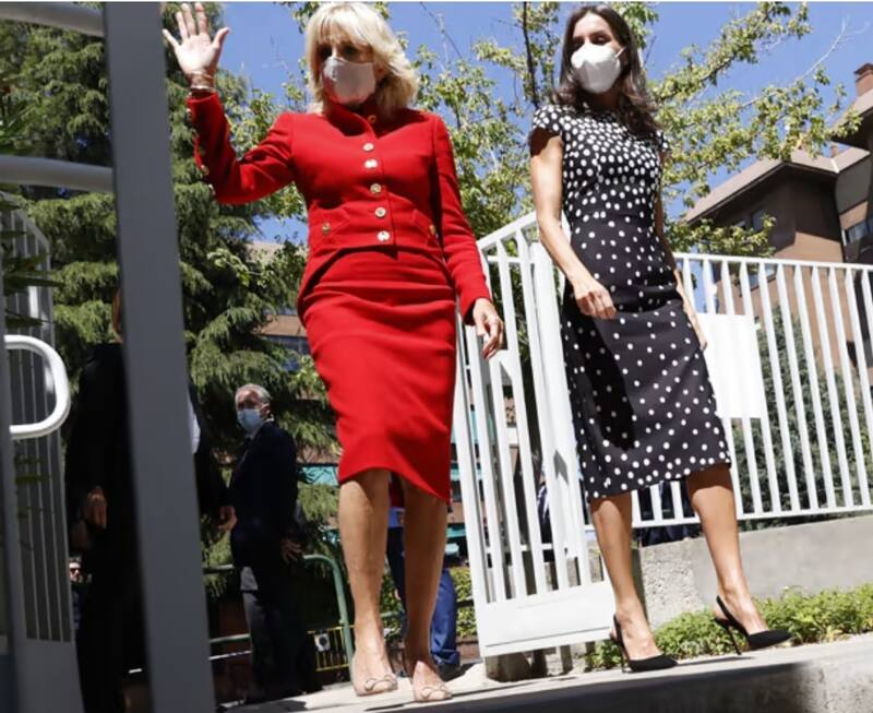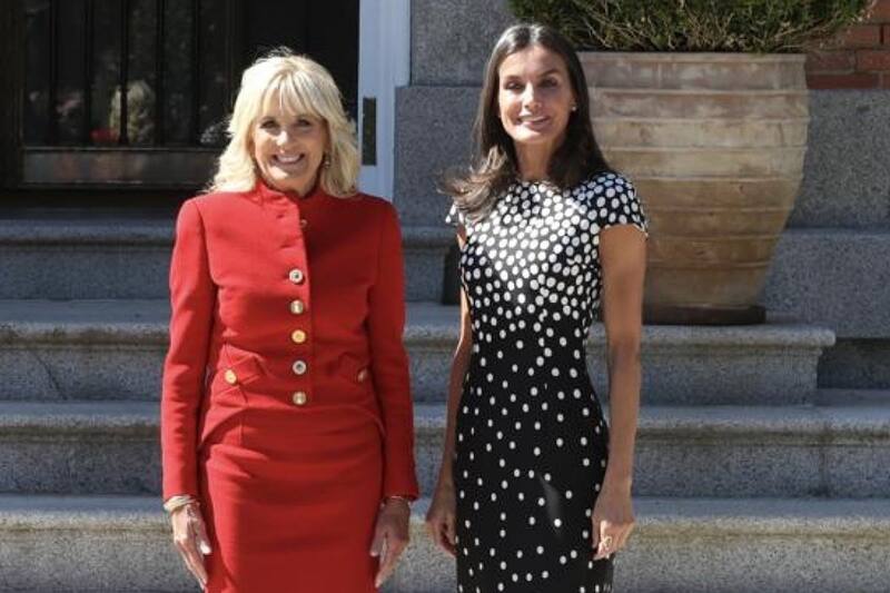 La reina estrenó un vestido negro de lunares blancos del diseñador español José Hidalgo, mientras que Jill Biden apostó por el rojo para esta ocasión en un salón del Palacio de la Zarzuela que tiene grandes ventanales, sofás y alfombras roa con mesa de centro.