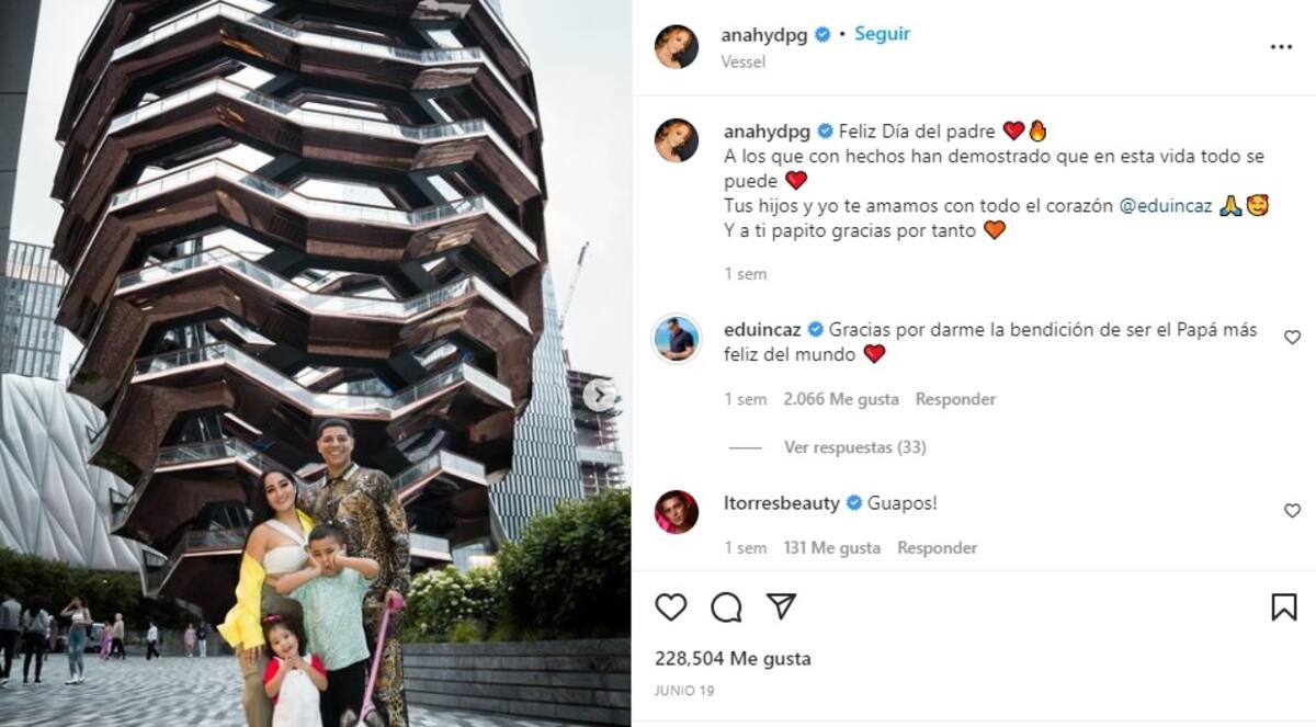 "Tus hijos y yo te amamos con todo el corazón @eduincaz Y a ti papito gracias por tanto", escribió, a lo que el artista respondió: "Gracias por darme la bendición de ser el Papá más feliz del mundo".
