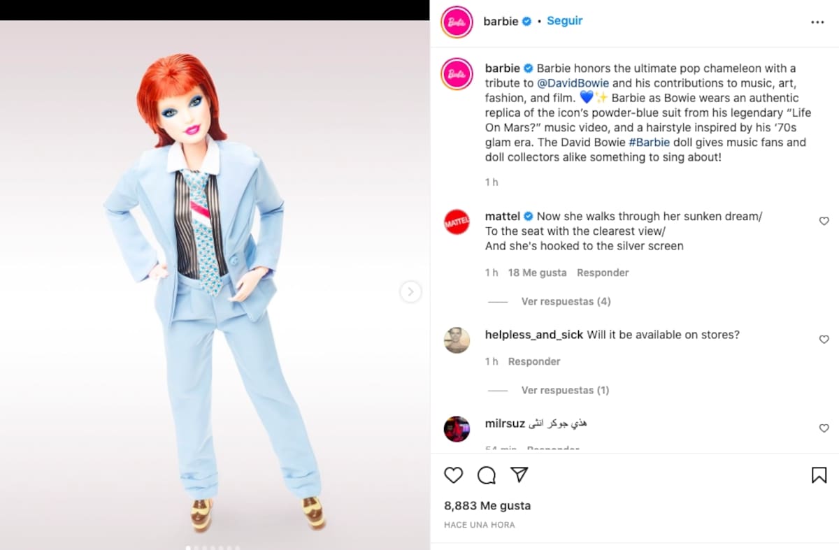En la cuenta oficial de Barbie en Instagram se lee: "¡La muñeca #Barbie de David Bowie les da a los fanáticos de la música y a los coleccionistas de muñecas algo sobre lo que cantar!".