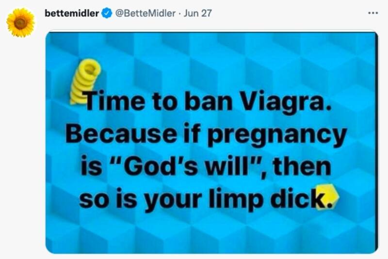 Bette Midler escribió: "Es hora de prohibir el Viagra porque si el embarazo es "la voluntad de Dios", entonces también lo es tu pene flácido".