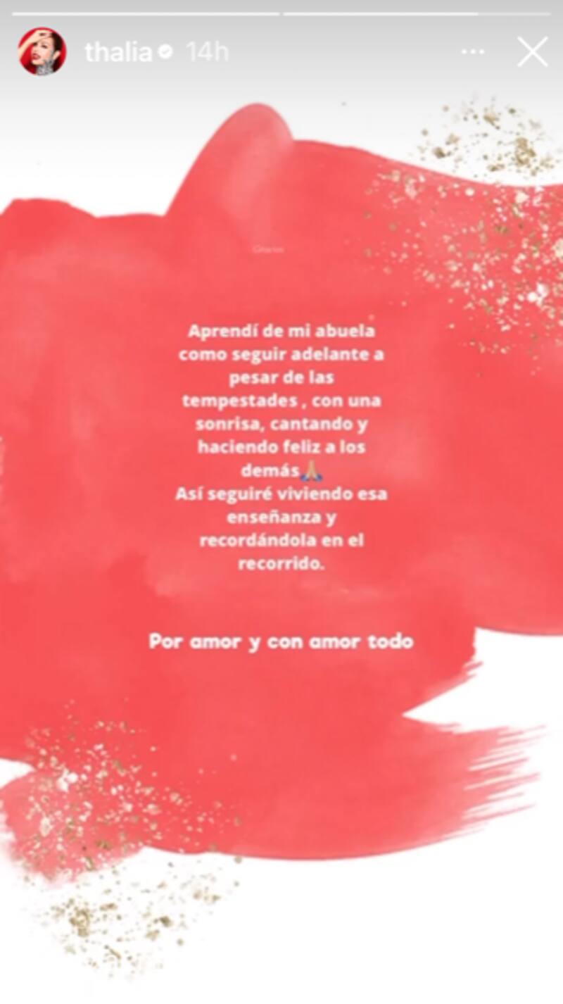 "Aprendí de mi abuela como seguir adelante a pesar de las tempestades, con una sonrisa, cantando y haciendo feliz a los demás. Así seguiré viviendo esa enseñanza y recordándola en el recorrido. Por amor y con amor todo", escribió la actriz y cantante, quien está próxima a cumplir 51 años.
