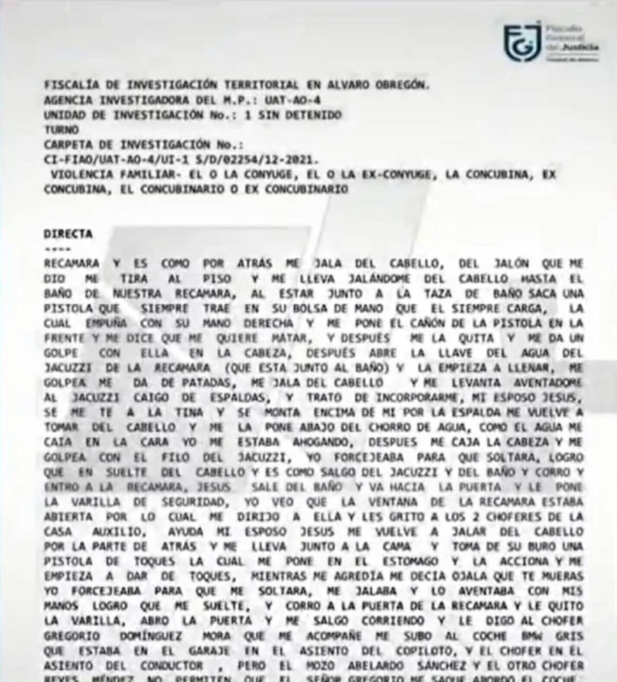 “Mi esposo comenzó a agredirme de manera física y verbal. Me dijo que era una prostituta, una golfa y me pegó varias patadas cuando estábamos en el estacionamiento”, declaró.