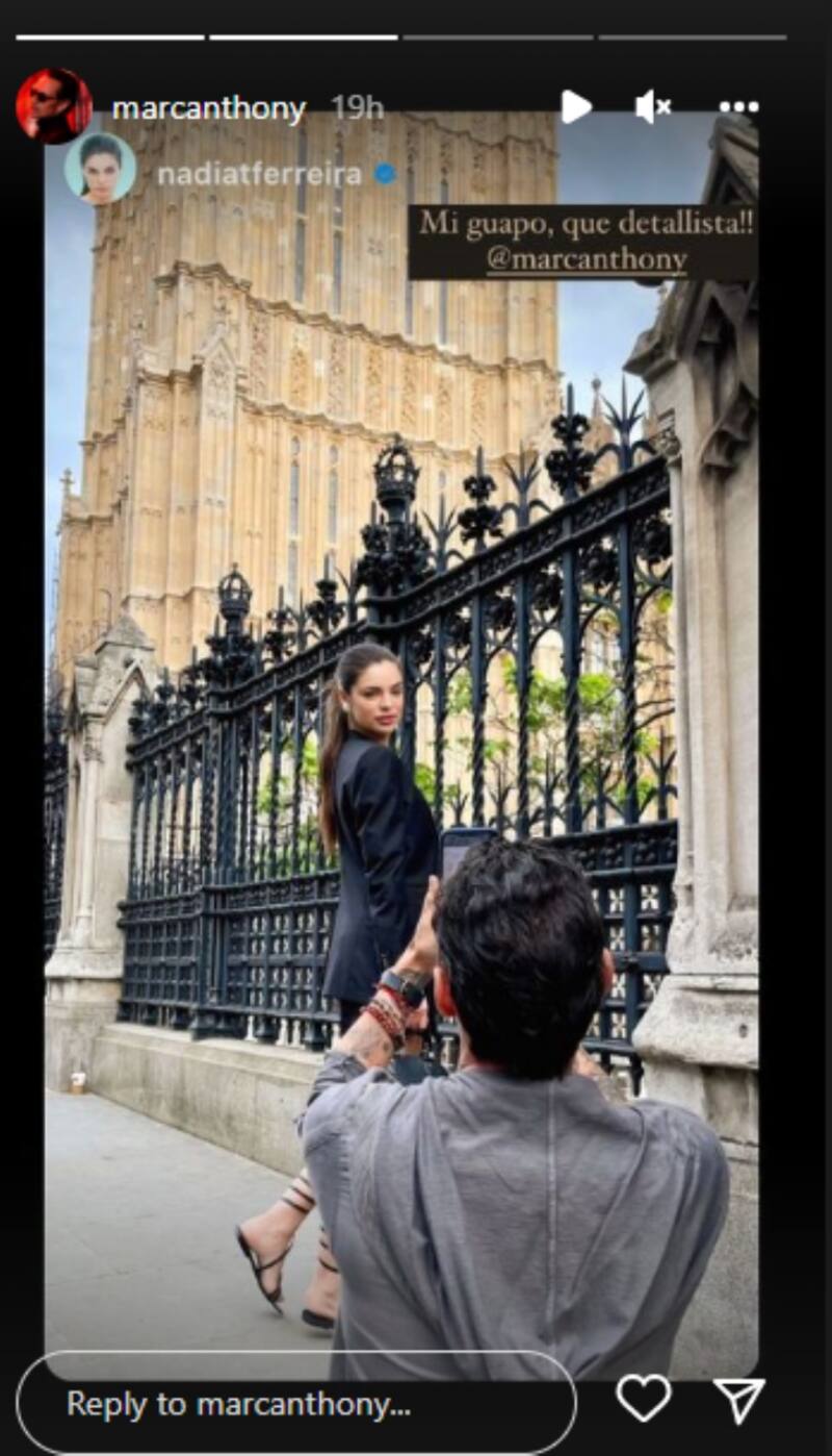 La pareja aprovechó la presentación del cantante para llegar días antes a Londres y aprovechar su paso por Inglaterra para visitar los sitios más representativos como el Palacio de Westminster donde Nadia posó demostrando su talento frente a la cámara que sostenía su novio Marc Anthony.