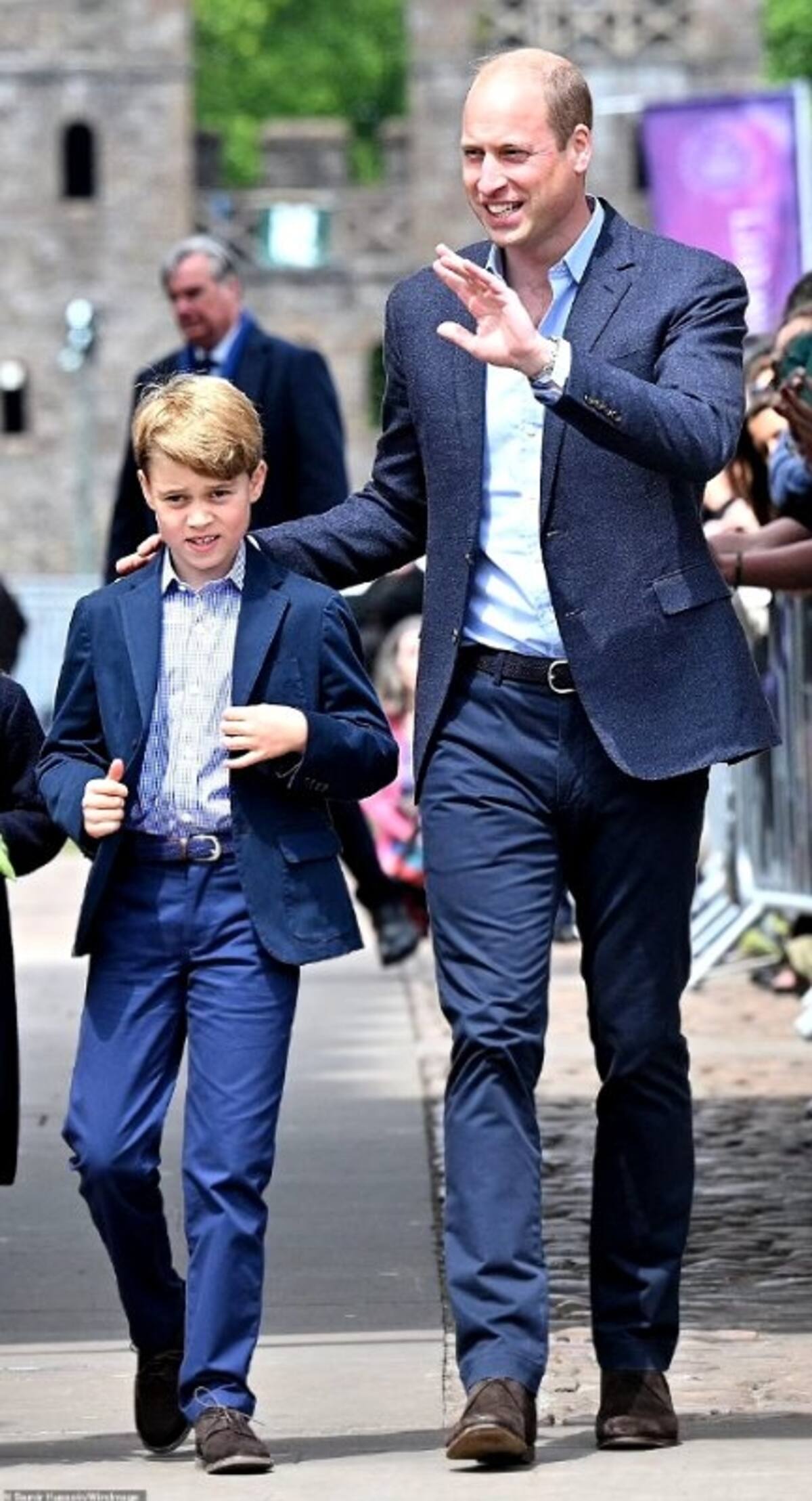 George lució una elegante camisa azul bebé de cuadros con una chaqueta y pantalones azul marino y zapatos marrones estilo mocasín. Mientras que su papá, vistió un look idéntico que combinaba perfectamente con su hijo.