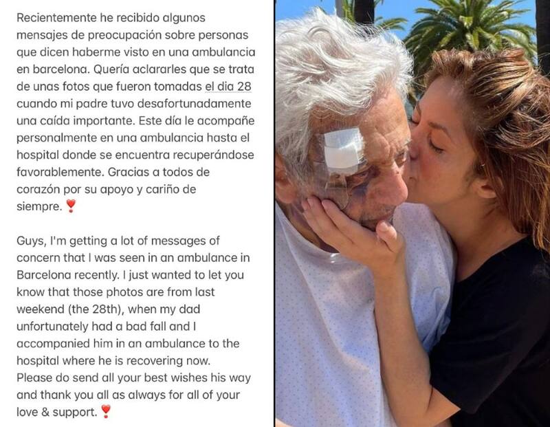 "Recientemente he recibido algunos mensajes de preocupación sobre personas que dicen haberme visto en una ambulancia en Barcelona. Quería aclararles que se trata de unas fotos que fueron tomadas el día 28 cuando mi padre tuvo desafortunadamente una caída importante. Este día le acompañé personalmente en una ambulancia hasta el hospital dónde se encuentra recuperándose favorablemente. Gracias a todos de corazón por su apoyo y cariño de siempre", escribió en el breve comunicado al pie de una foto en la que aparece besando en la mejilla a su padre con una herida importante en el rostro.