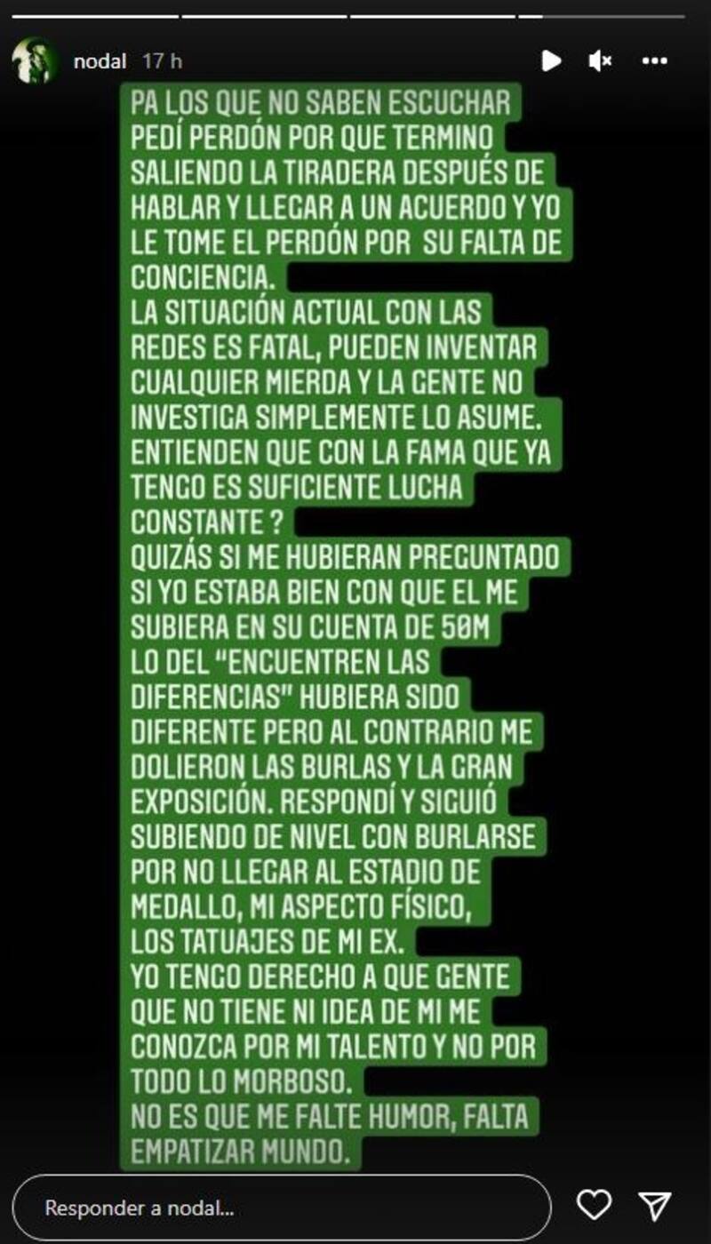 "Me dolieron las burlas y la gran exposición respondí y siguió subiendo de nivel con burlarse por no llegar al Estadio de Medallo, mi aspecto físico, los tatuajes de mi ex. Yo tengo derecho a que gente que no tiene ni idea de mí, me conozca por mí talento y no por todo lo morboso. No es que me falte humor, falta empatizar mundo", publicó.
