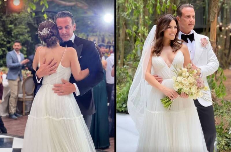 A través de redes sociales la presentadora de televisión compartió algunas fotografías de su boda en la que se puede ver el vestido que eligió.  Un diseño de tirantes, sencillo y sofisticado. El guapo actor portó dos sacos diferentes, uno en color blanco para la ceremonia y uno negro para la fiesta.