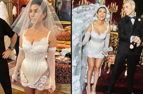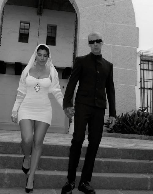 Kourtney Kardashian lució un minivestido de encaje y satén Dolce & Gabbana Alta Moda, inspirado en la lencería italiana de los años 60, acompañado de un amplio velo que tenía impreso una imagen sacra, la cual eligió inspirada en el tatuaje que porta Travis Barker en su cabeza.