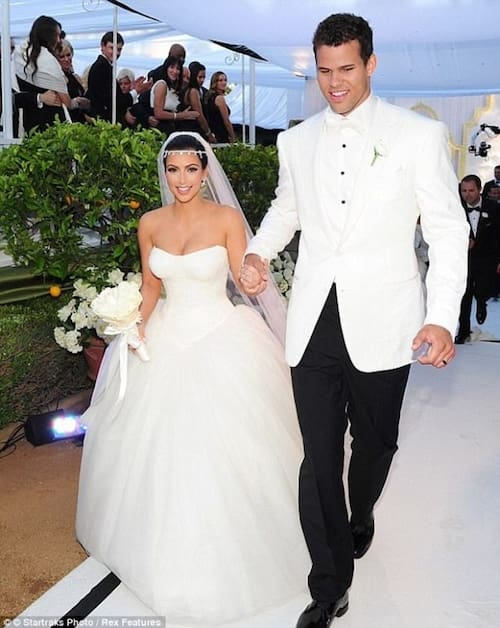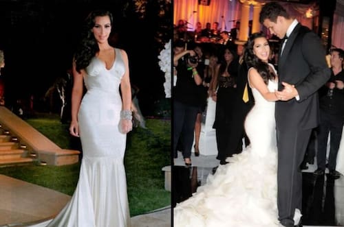 En esta ocasión, Kim Kardashian usó un vestido de la marca Givenchy, corte sirena, manga larga de encaje, con aplicaciones de encaje transparente. Se estima que el costo fue de más de medio millón de dólares. Y como dicta la costumbre, la boda fue televisada en la novena temporada de su famosa serie.
