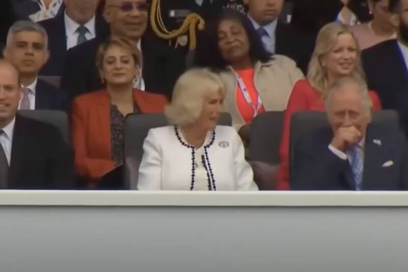 Camilla es vista en un video publicado por el medio The Independent, preguntándole al futuro rey qué lo hizo reírse tanto. Él aparece explicándole, y ella sonríe pero no se ríe tanto como él.