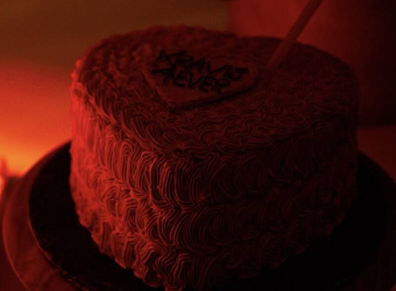 Otra fotografía mostró unos detalles del pastel con betún rojo, en forma de corazón y que tenía escrito: "KRAVIS 4EVER".