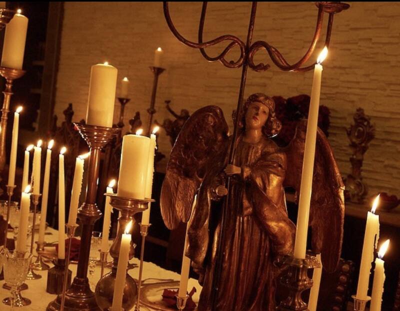 En el carrete de fotos se puede observar la decoración de la mesa la cuál fue ambientada al estilo medieval, llena de candelabros, porta velas y figuras de bronce.