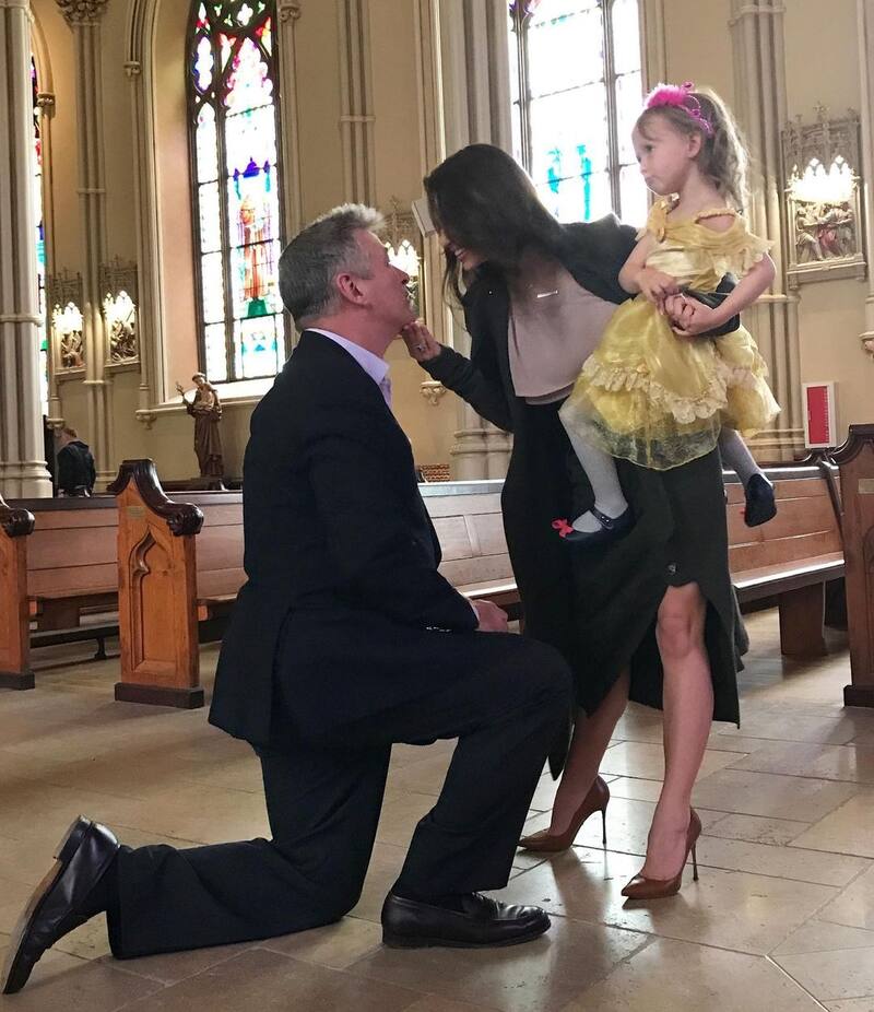 En esta década, la pareja ha enfrentado todo tipo de experiencias y para celebrarlo Hilaria publicó una fotografía en la que se le ve a ella, cargando a su hija Carmen en brazos, mientras Alec está arrodillado frente a ella, al interior de una iglesia.