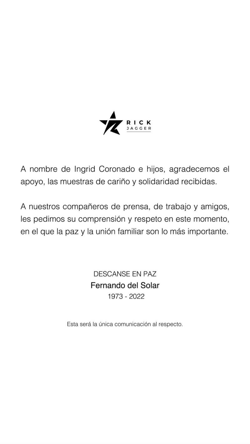 "A nombre de Ingrid Coronado e hijos, agradecemos el apoyo, las muestras de cariño y solidaridad recibidas. A nuestros compañeros de prensa, de trabajo y amigos, les pedimos su comprensión y respeto en este momento, en el que la paz y la unión familiar son lo más importante", se lee en el comunicado.