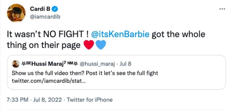 Segundos después, se le vio agitando el micrófono contra alguien. No es posible ver si golpeó o no a alguien. En su cuenta de Twitter, Cardi B aludió al incidente diciendo que no fue una pelea. Y también, posteando que no creyeran todo lo que ven. Y remitió a una cuenta de Twitter para que vieran un ángulo diferente.