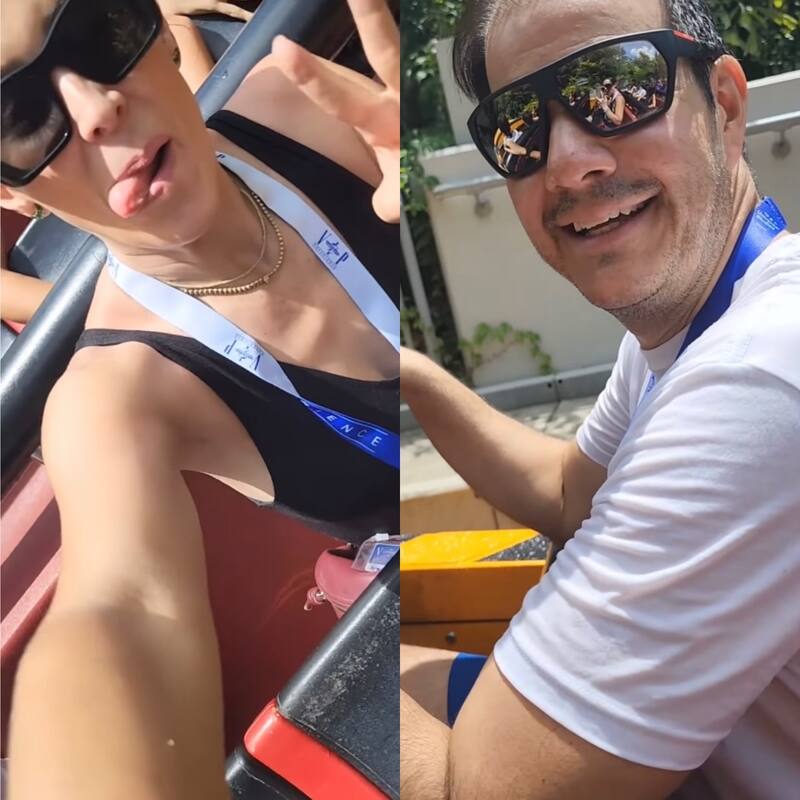 La también presentadora de televisión se subió con su esposo e invitados a las distintas atracciones del parque y mientras los pequeños gritaban, Jacky y Martín disfrutaban al máximo. “A seguirnos mojando”, gritaba la actriz antes de subirse a un nuevo juego.